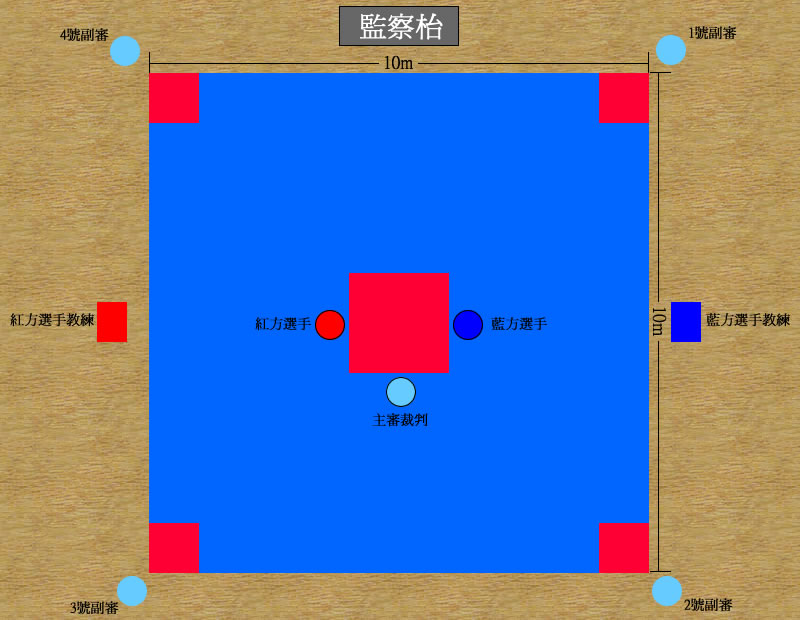 跆拳道的自由搏擊比賽會在一個10米乘10米的軟墊上進行,共有一名主審裁判站於賽區中央主持比賽和四名副審裁判分別坐於賽區四角負責計分工作。藍方選手和其教練會在主審的右邊,而紅方選手和其教練則在主審的左邊。賽區正面有一監察枱,主要負責監察賽事和作記錄的工作。